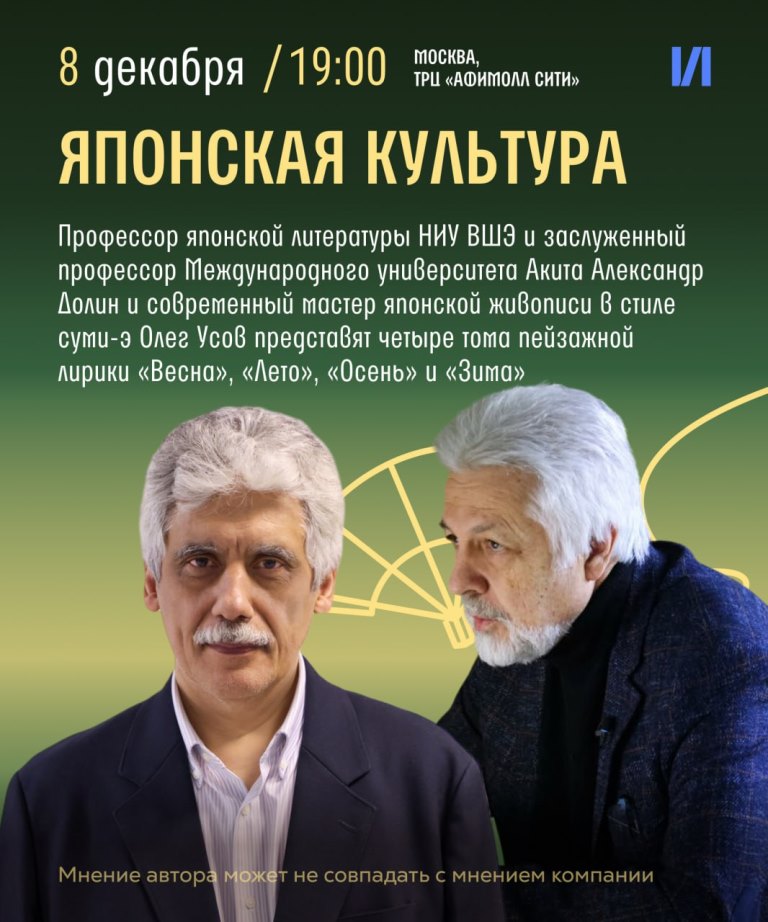 8 декабря 2025 г. в Москве, в ТРЦ Афимолл сити состоится презентация 4х-томника пейзажной лирики «Весна», «Лето», «Осень» и «Зима». Презентацию проводят профессор японской литературы НИУ ВШЭ А. Долин и мастер японской живописи в стиле суми-э Олег Усов. Вход свободный.