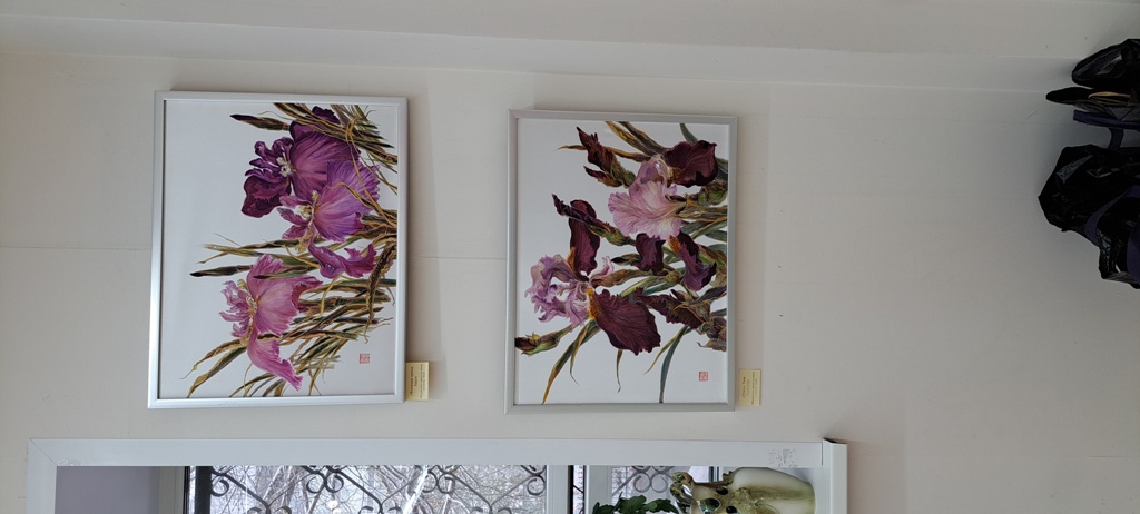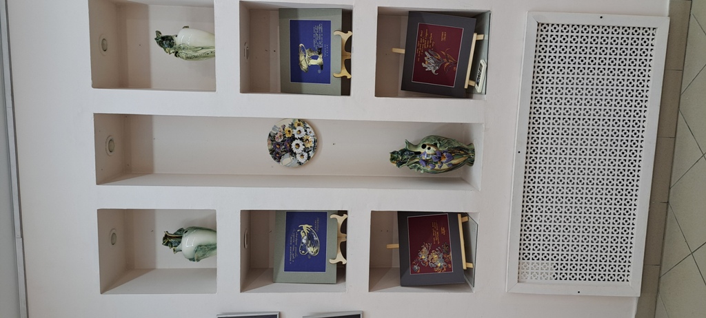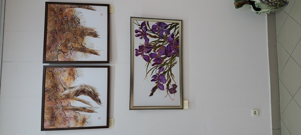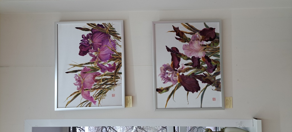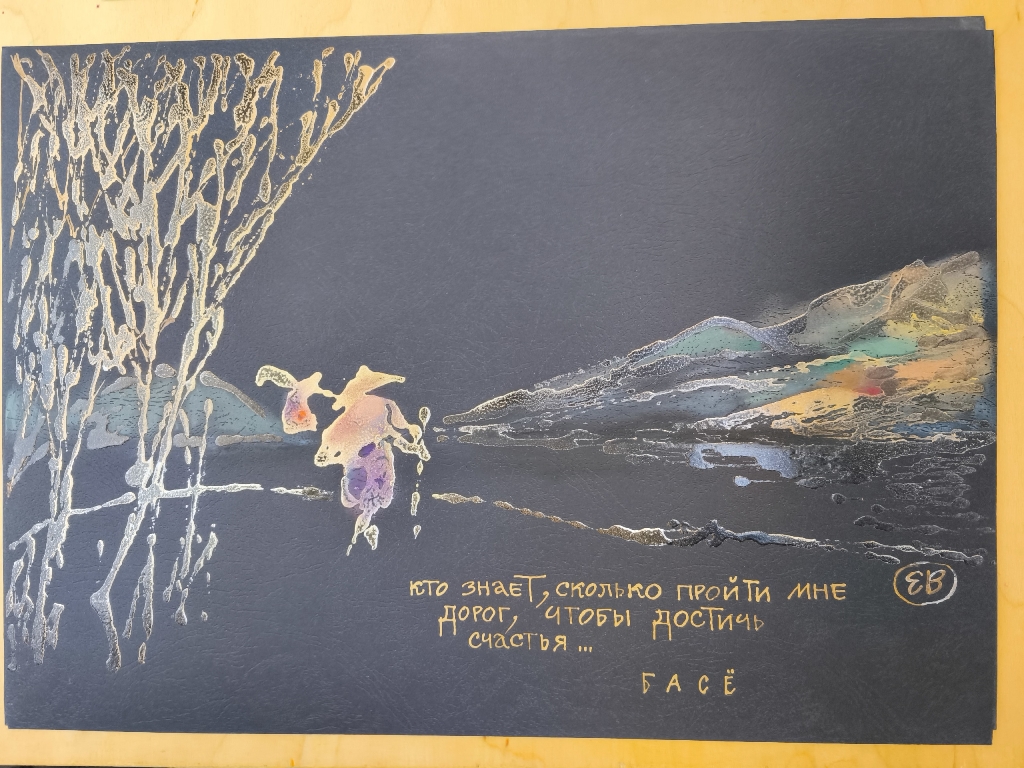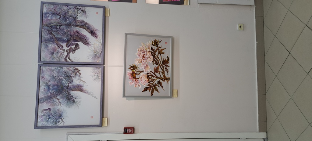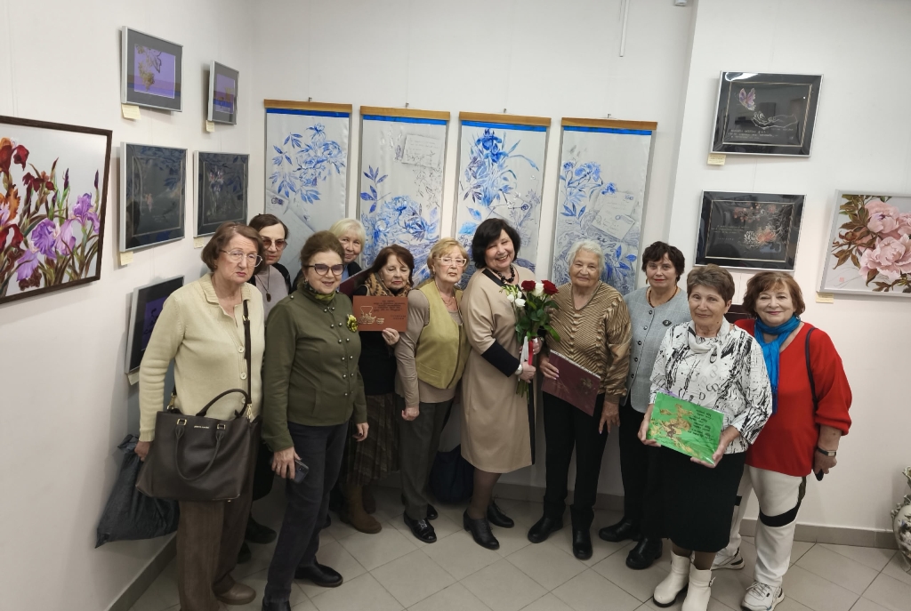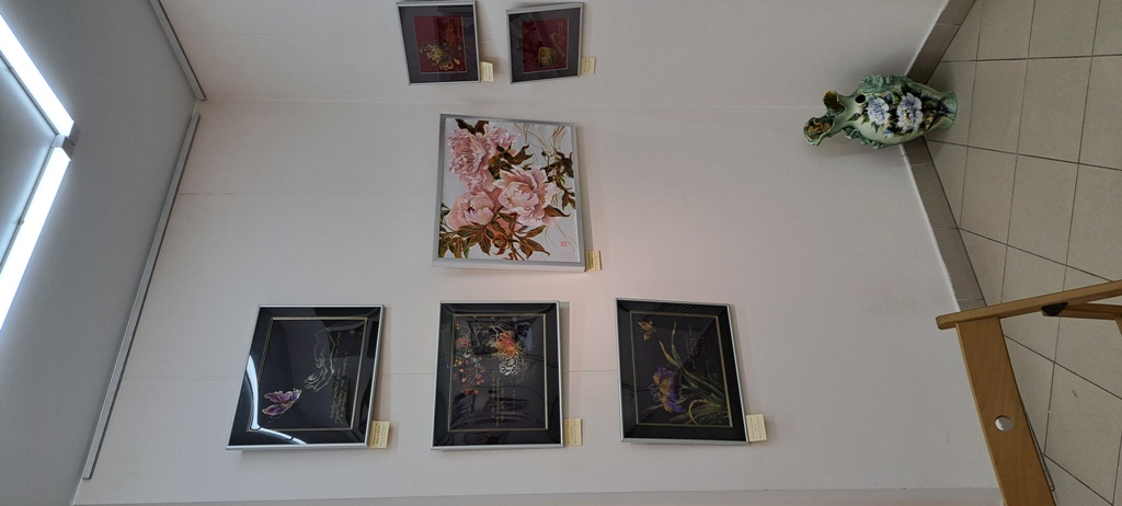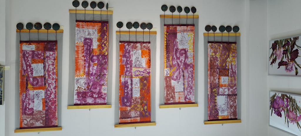 В экспозиции присутствуют цветочные мотивы, загадочный скифский мир, обыгранный Еленой Витальевной в изысканном материале (шелк), графические рисунки на стихи великих поэтов.