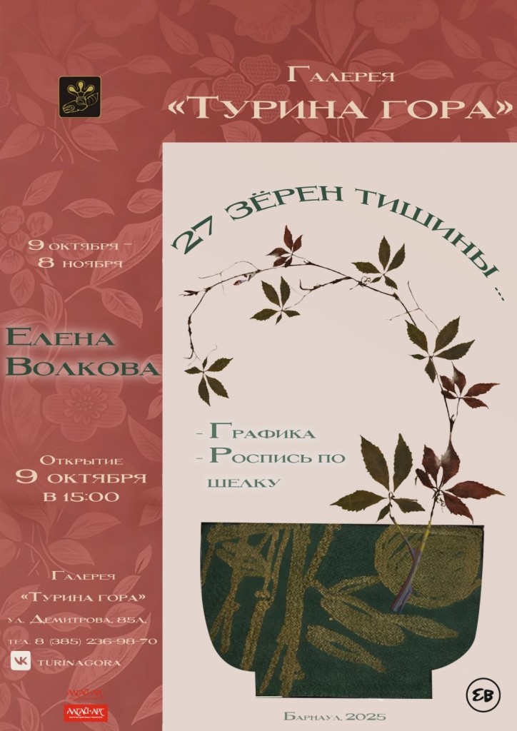 Посредине золотой осени в Галерее ТУРИНА ГОРА (Барнаул) открылась персональная выставка члена Алтайского регионального отделения ОРЯ, уникальной художницы-графика ЕЛЕНЫ ВОЛКОВОЙ «27 зерен тишины» .