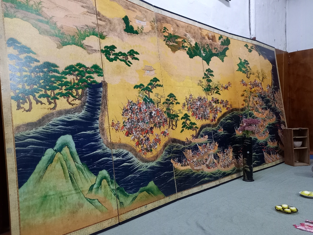 Украшением чайного пространства стала копия ширмы «Битва при Ясима», изготовленная в клубной мастерской и вызвавшая восхищение у гостей.