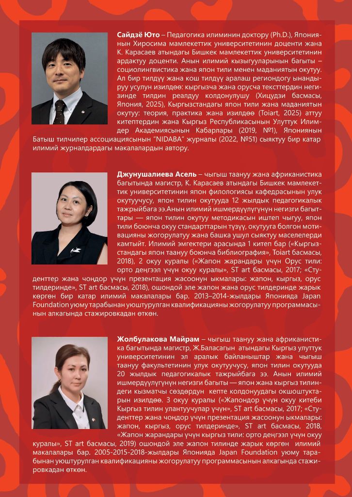 Монография обобщает результаты многолетнего сотрудничества между исследователями Японии и Кыргызстана и рассматривает ключевые аспекты преподавания японского языка и изучения японской культуры в кыргызском контексте.
