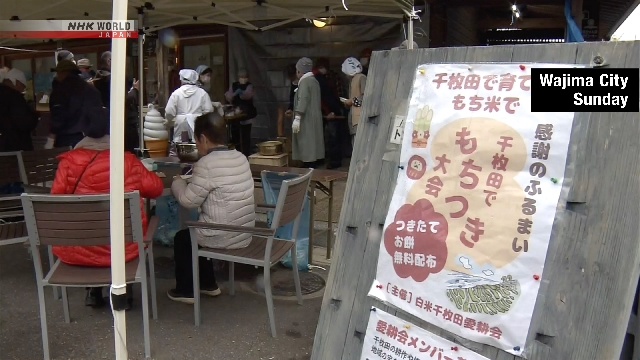 NHK World. В воскресенье посетители террасных рисовых полей на побережье полуострова Ното в центральной Японии смогли насладиться свежеприготовленными рисовыми лепешками.