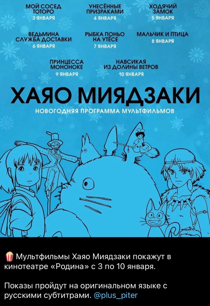 Мультики Хаяо Миядзаки покажут в кинотеатре «Родина» с 3 по 10 января. Аниме будут «крутить» в оригинале с русскими субтитрами.
