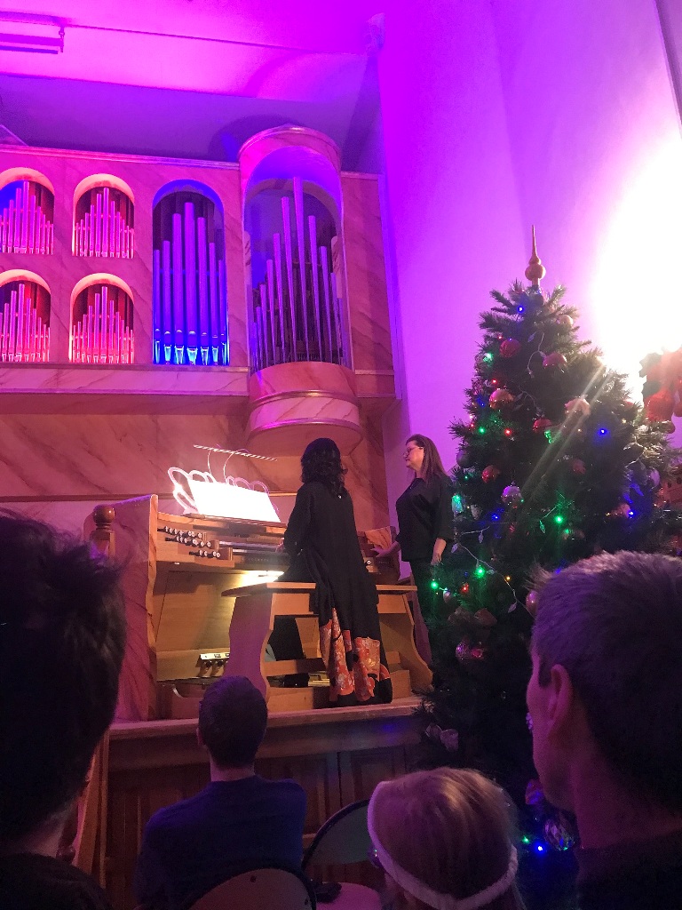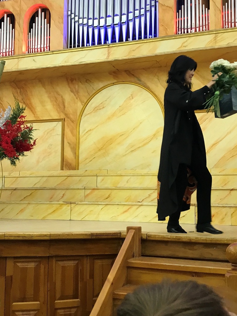 Буквально на другой день здесь выступала наша чудесная Хироко. Не смогла приехать на День города из-за гастрольных туров, зато вырвалась к нам в последние недели уходящего года со своей изумительной Рождественской фантазией. Стройная, гибкая, как лоза, в изящно обвивающем ее стан черном кимоно с красным драконом сзади, вихрем вьющемся за ней, она легко впархивала к светящемуся в полутьме инструменту и длинными тонкими пальчиками виртуозно играла Иоганна Себастьяна Баха, французов Эжена Жигу, Сезара Франка, Клода Бальбатра, современного японского композитора Юи Какинума. Какинума основывает свои произведения на музыке для театра Но, традиционной японской музыке, классике других азиатских стран. Наша прелестная гостья училась игре на органе в Японии, в России и в Голландии (исторический орган — это особая статья), но остановила выбор на нашей стране, где уже более 20 лет живет и работает. Как сказала ведущая концерта, Хироко органично соединяет в своем творчестве восток и запад, а мостом стала для нее Россия.