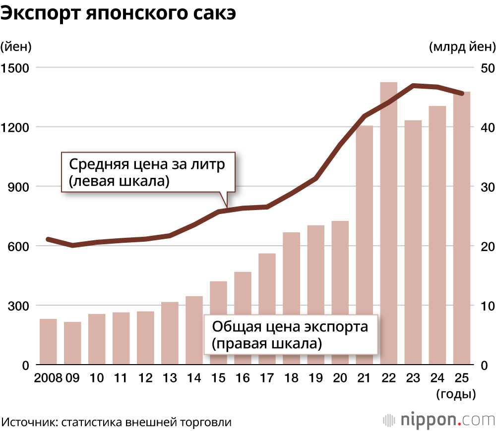 Согласно отчёту Японской ассоциации производителей саке и сётю, по оценкам, экспорт сакэ в 2025 году увеличился на 5,5% в стоимостном выражении по сравнению с предыдущим годом и составил 45,88 млрд йен, а по объёму – на 8,0% до 33 500 килолитров. Несмотря на влияние дополнительных пошлин, введённых Соединёнными Штатами, как стоимость, так и объём растут второй год подряд.