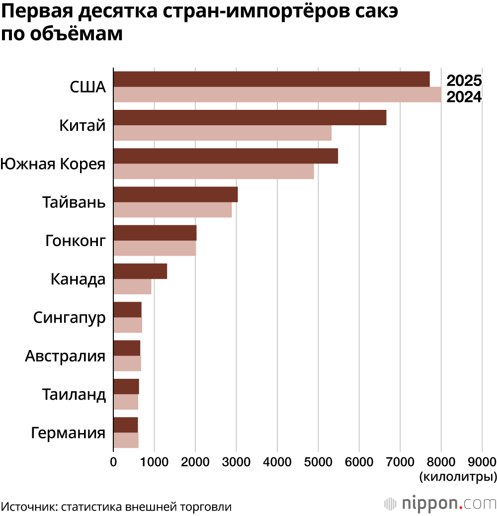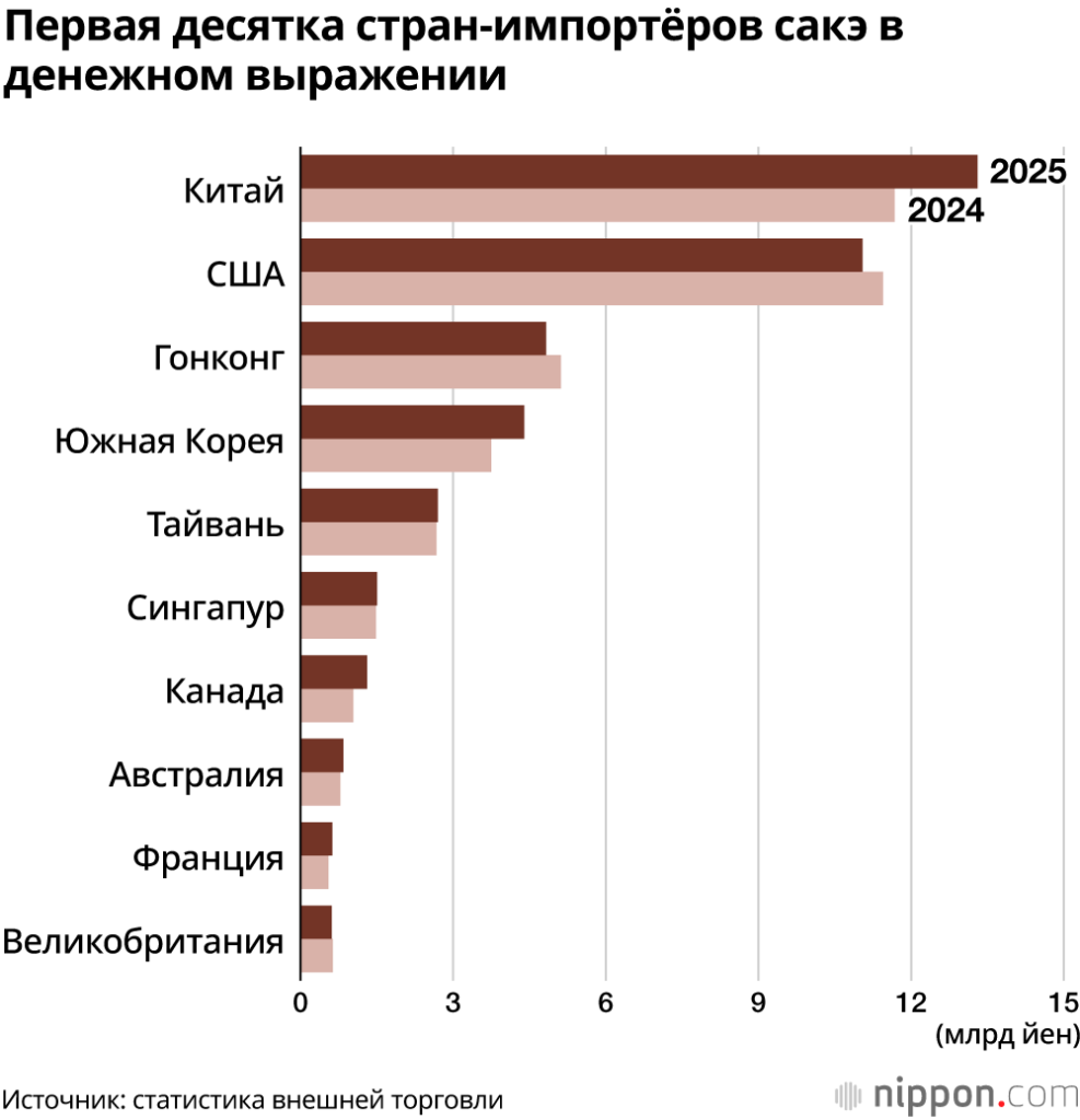 Оригинал: Японская ассоциация производителей сакэ и сётю: Показатели экспорта саке в 2025 году