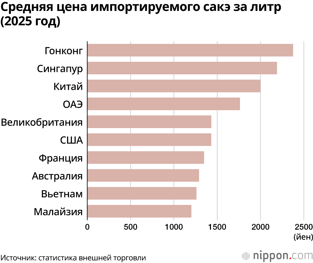 Средняя экспортная стоимость литра составила 1368 йен, что в 1,8 раза выше, чем десять лет назад (771 йена). Тенденция к относительно высоким ценам на сакэ, определяющая ситуацию на мировом рынке, сохраняется: цены в Гонконге и Сингапуре, как и в прошлом году, превысили 2000 йен. Тем временем в Китае сакэ прочно закрепилось на рынке, выросли объёмы импорта, что привело к снижению цен с 2193 йен в прошлом году до 1998 йен в прошлом году.