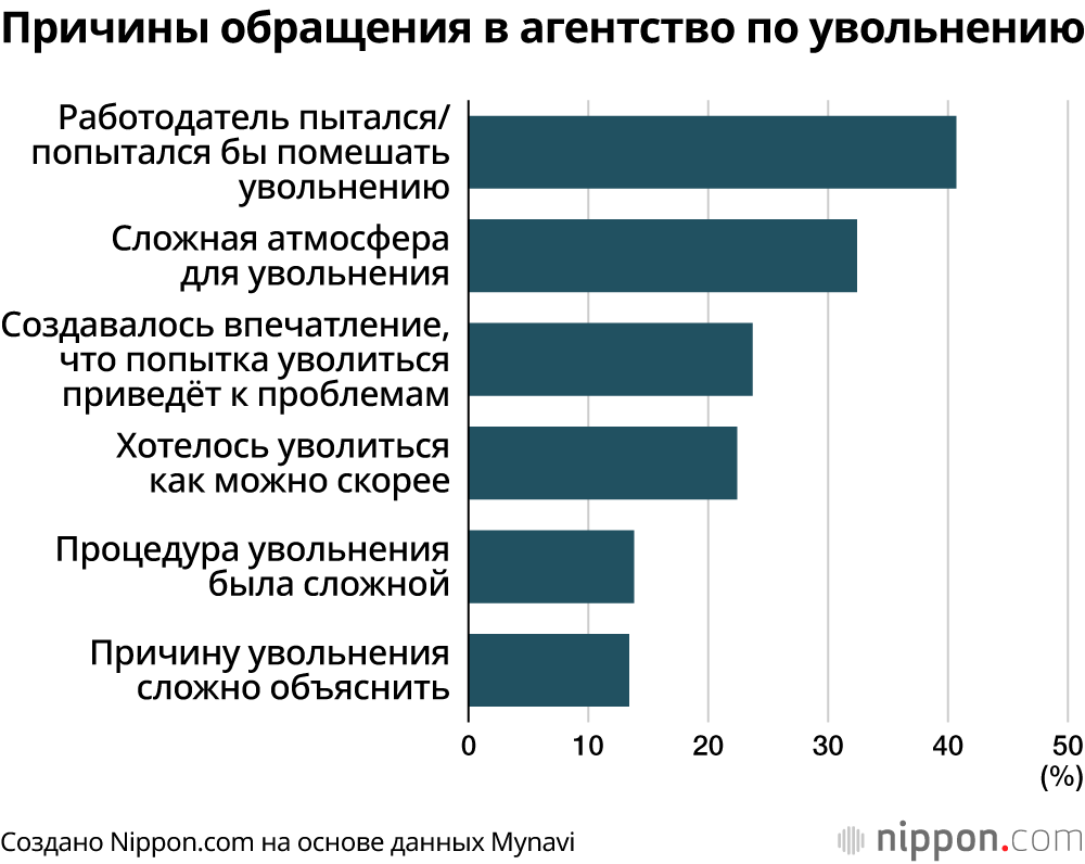 Согласно отчету, опубликованному в октябре 2024 года платформой по поиску работы Mynavi, среди 800 опрошенных (допускалось несколько вариантов ответа) основной причиной обращения в такие агентства стало то, что руководство «пыталось или попыталось бы помешать увольнению» (40,7%). Вторым по популярности ответом стал вариант «Я находился в такой атмосфере, где невозможно было открыто сказать о желании уволиться» (32,4%). Именно эта причина чаще всего встречалась в интервью, которые автор проводил лично.