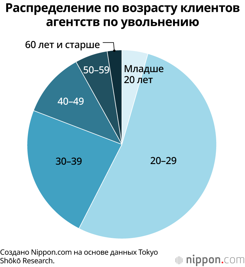 Как показывает пример женщины за сорок, услугами агентств по увольнению пользуется не только молодежь. Опрос, проведенный Tokyo Shōkō Research со 2 по 9 июня, выявил, что хотя 53,7% клиентов составляют люди в возрасте около двадцати лет, 35% приходится на тридцатилетних и сорокалетних. Это подтверждает, что спрос на подобные услуги растет даже среди опытных сотрудников среднего звена.