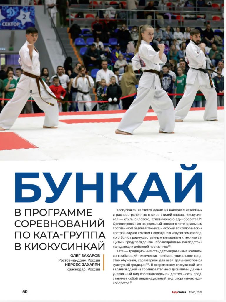 Статья руководителя Ростовского отделения Общества «Россия-Япония», заместителя Главного редактора журнала «Будо Глобал» по международному сотрудничеству Олега Захарова «БУНКАЙ В ПРОГРАММЕ СОРЕВНОВАНИЙ ПО КАТА-ГРУППА В КИОКУСИНКАЙ» посвящена соревновательным аспектам киокусинкай в дисциплине ката-группа.