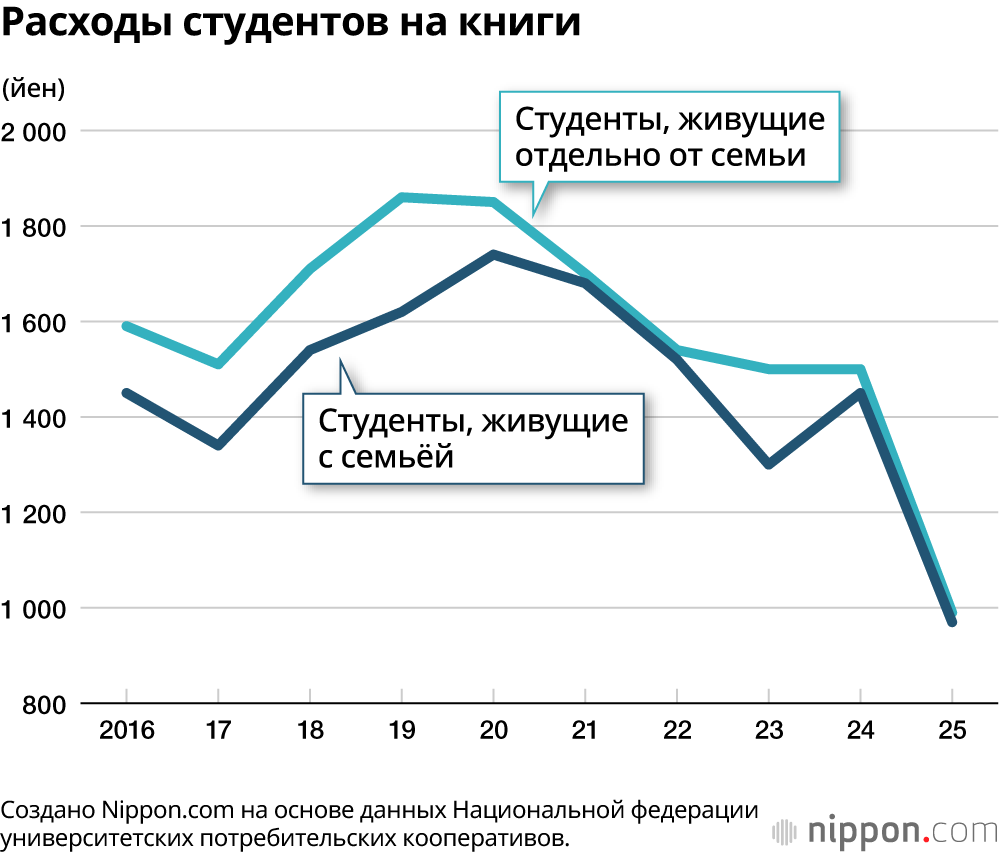 В феврале 2026 года Национальная федерация университетских потребительских кооперативов опубликовала результаты исследования условий студенческой жизни в Японии, проведённого осенью предыдущего года. Анализ ежемесячных расходов показал рост затрат на питание, что отражает общее повышение цен. При этом расходы на книги, и без того снижавшиеся на протяжении ряда лет, впервые за десять лет опустились ниже 1000 йен.