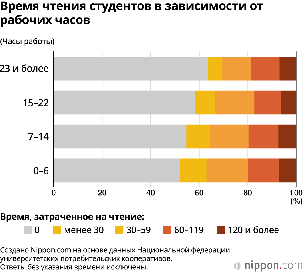 Студенты, работающие больше, читают меньше. Доля тех, кто ответил, что тратит на чтение «ноль минут» в день, составила 63,6% среди работающих 23 часа и более в неделю – против 52,2% среди работающих менее 7 часов. Это наглядно показывает зависимость: чем меньше рабочих часов, тем больше времени остаётся на чтение. Вместе с тем часть студентов читает по 60 минут и более вне зависимости от загруженности, что говорит о разделении студентов на две группы: тех, кто не читает совсем, и тех, кто находит время для чтения даже при плотном графике.