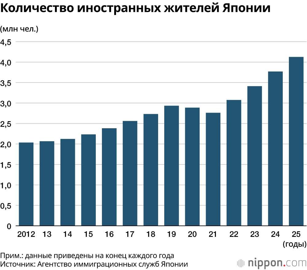 Агентство иммиграционных служб Японии объявила, что к концу 2025 года число иностранных граждан, проживающих в стране, достигло 4 125 395 человек, это новый рекордный показатель, который растёт четвёртый год подряд, и на 356 418 человек (9,5%) больше, чем в аналогичный период прошлого года. Впервые это число превысило 4 миллиона. По префектурам наибольшее число иностранных граждан проживает в Токио – 801 438 человек, на 8,5% больше, чем в аналогичный период прошлого года, что составляет 19,4% от общего числа по стране. За ним следуют Осака (375 319 чел.), Айти (357 800 чел.) и Канагава (317 353 чел.), то есть наибольшая концентрация наблюдается в крупных мегаполисах.
