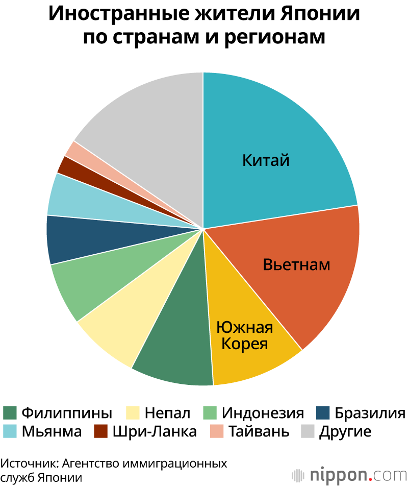 По странам и регионам происхождения иностранных жителей на Китай пришлось 930 428 человек, на Вьетнам – 681 100, на Южную Корею – 407 341. Среди 10 стран/регионов с наибольшим количеством выходцев из этих регионов незначительное снижение по сравнению с предыдущим годом наблюдалось среди граждан Южной Кореи и Бразилии. Значительно выросло количество граждан Мьянмы и Индонезии, на 35,7% и 33,2% соответственно.