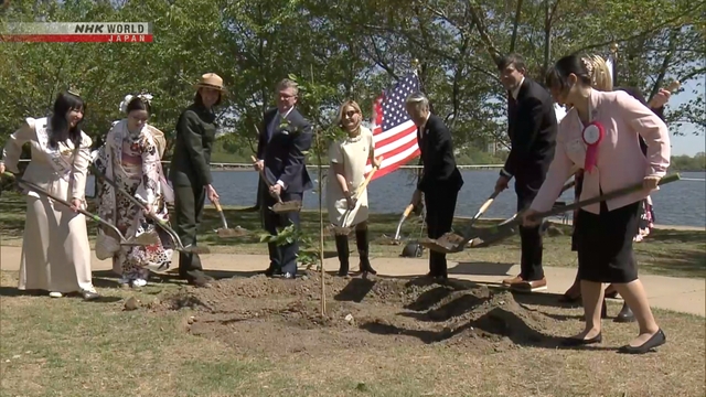 В пятницу в Вашингтоне состоялась церемония посадки саженцев деревьев сакуры, подаренных Японией, представителями Японии и США.