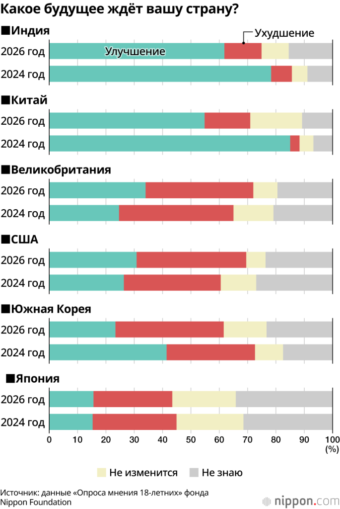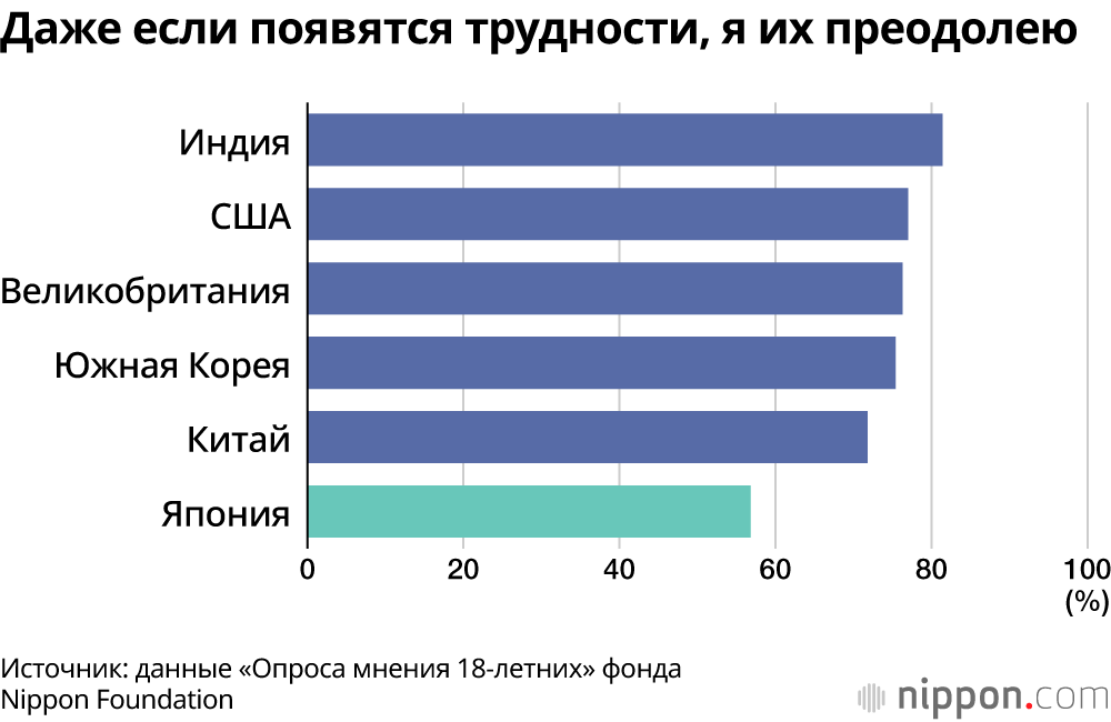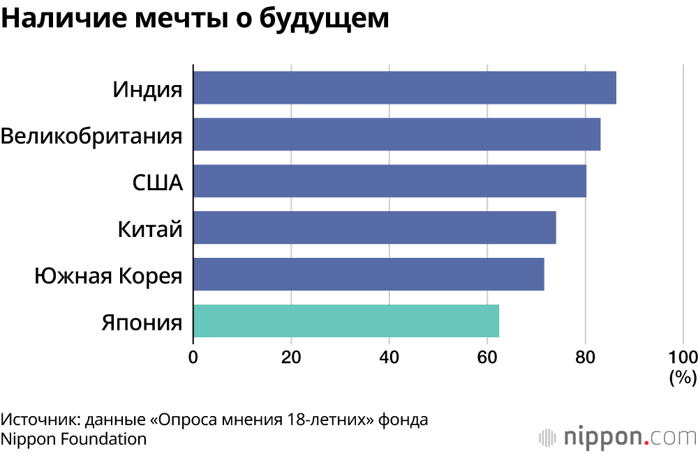 Фонд Nippon Foundation провёл исследование отношения 18-летних молодых людей к будущему в шести странах: Японии, США, Великобритании, Китае, Южной Корее и Индии, опросив по 1000 молодых людей в каждой стране. На вопрос «Есть ли у вас свои собственные мечты о будущем?» 86,3% респондентов в Индии, 83,1% в Великобритании и 80,2% в США ответили «да» (включая «отчасти»), тогда как в Японии – всего 62,4%.