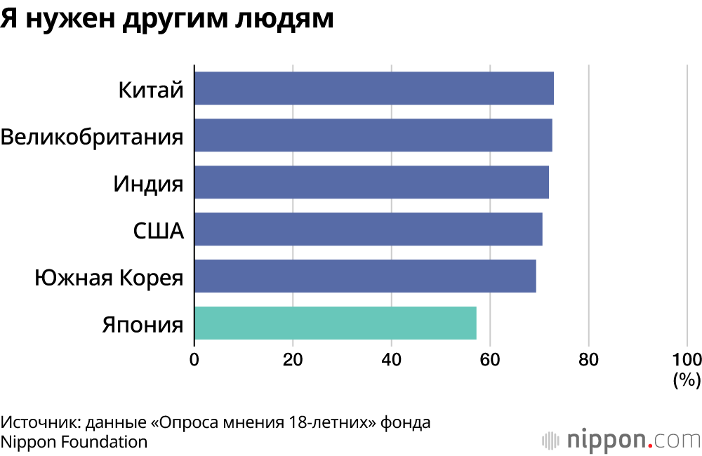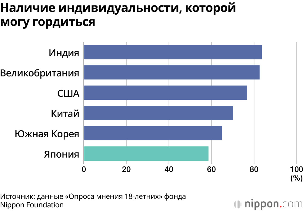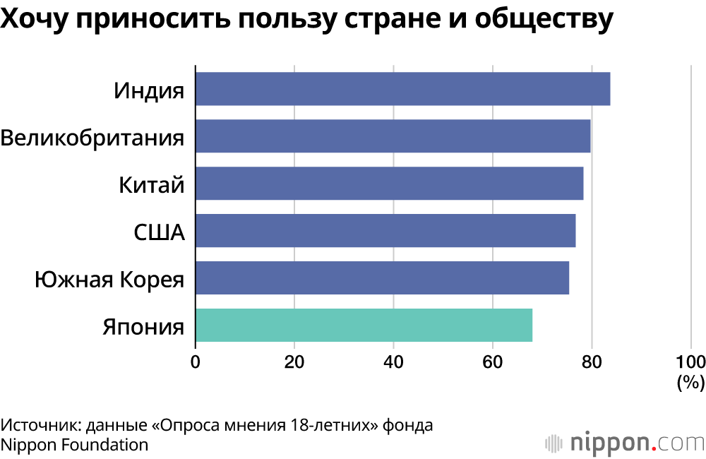 Что касается утверждений «У меня есть собственная индивидуальность, которой я могу гордиться» и «Я нужен другим людям», то процент людей, ответивших в Японии положительно, составил менее 60%, это исключительно низкий показатель. Осознанное желание «приносить пользу стране и обществу» в качестве члена общества также в Японии ниже по сравнению с другими странами.