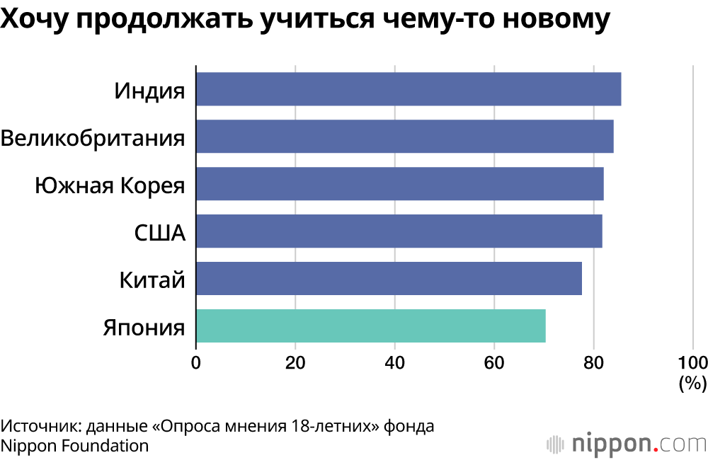 У японской молодёжи также низкая заинтересованность в том, чтобы продолжать учиться чему-то новому, пускай даже сейчас они не чувствуют себя нужными и пока никому не приносят пользу. Возможно, из-за низкой самооценки им не хватает уверенности в своих силах для преодоления трудностей.